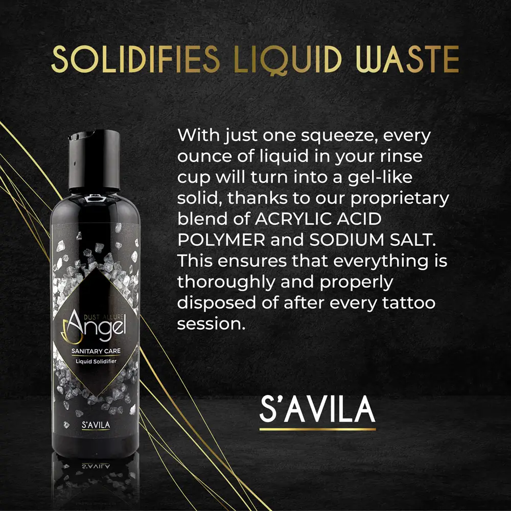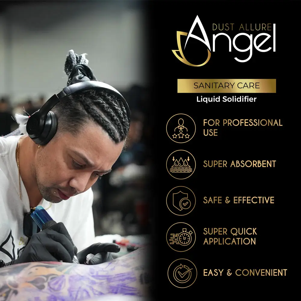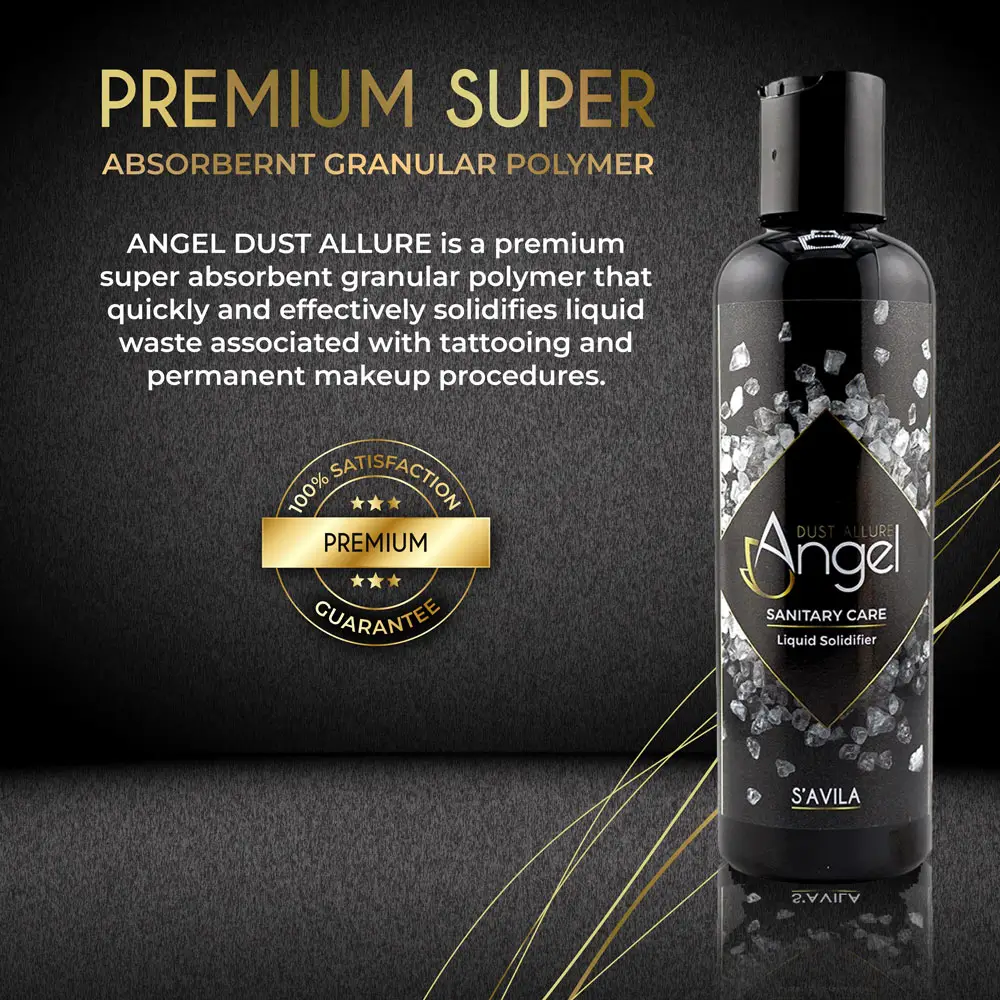 Angel Dust Allure turns tattoo ink, plasma, and liquid waste into a solid, gel-like mass. It uses a superabsorbent granular polymer that works fast. As a result, you keep your station cleaner during every session.