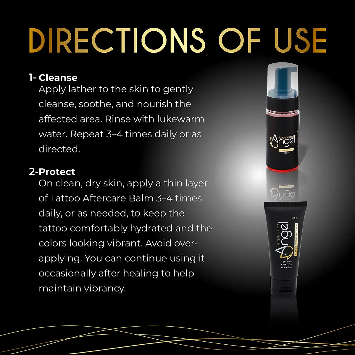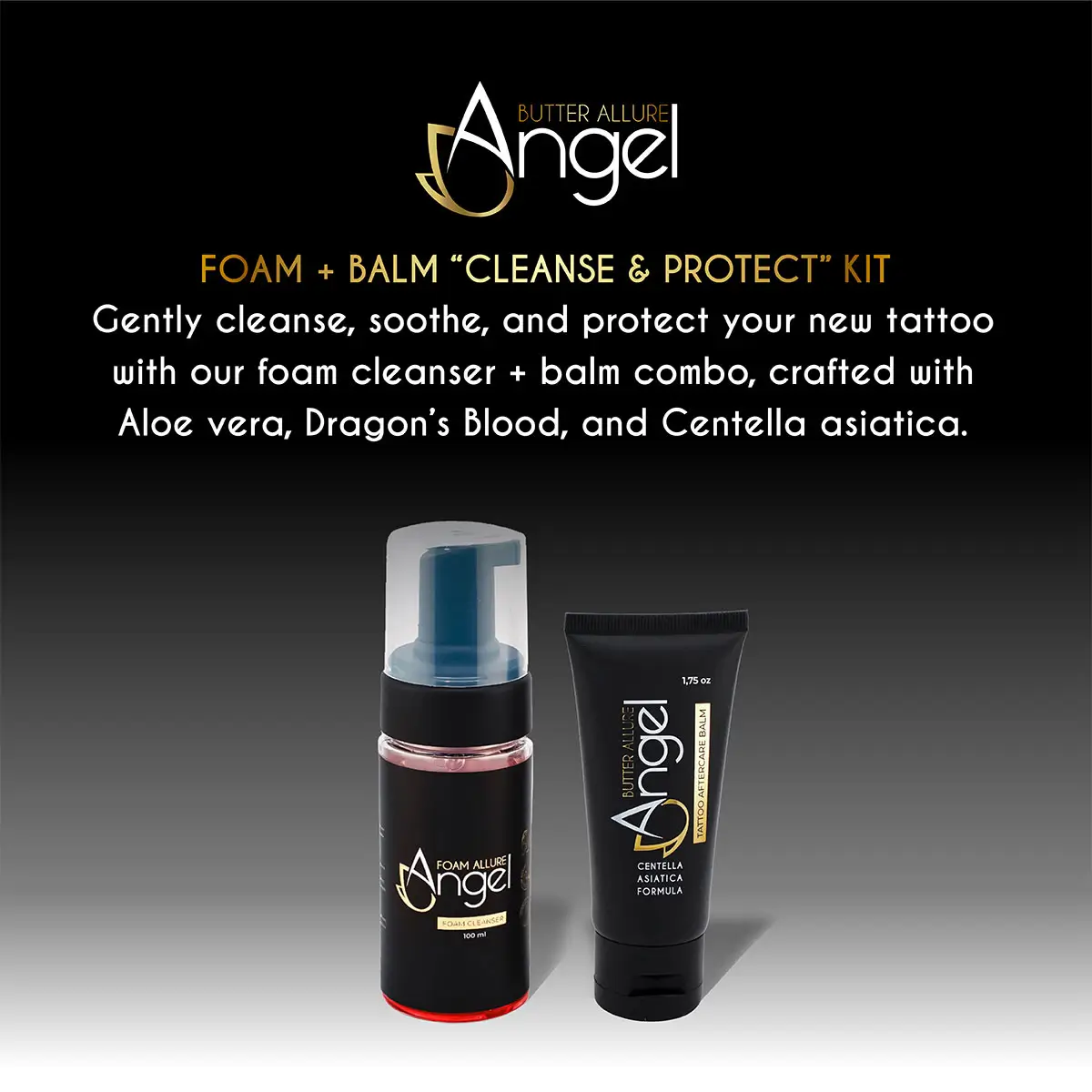 Keep your new tattoo clean, calm, and protected with the Foam + Balm “Cleanse & Protect” Kit. This simple two-step routine includes Angel Foam Allure plus Angel Butter Allure. Together, they help support comfortable healing and vibrant-looking ink.