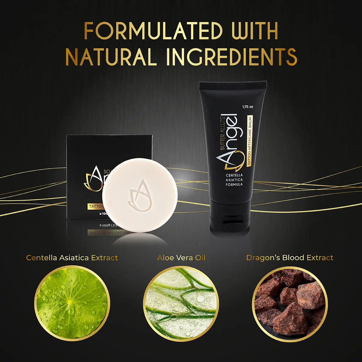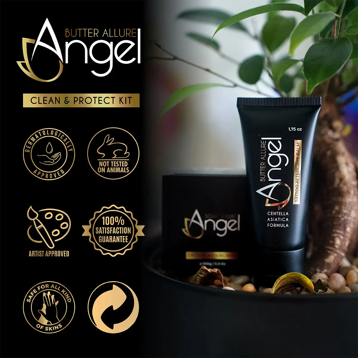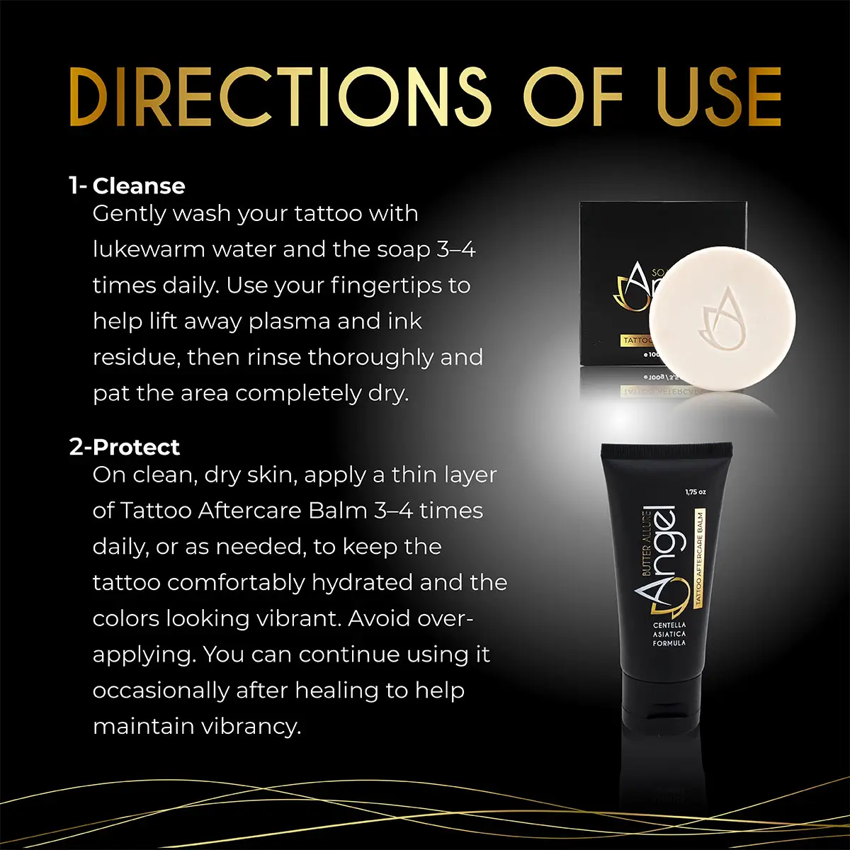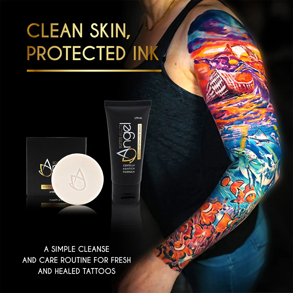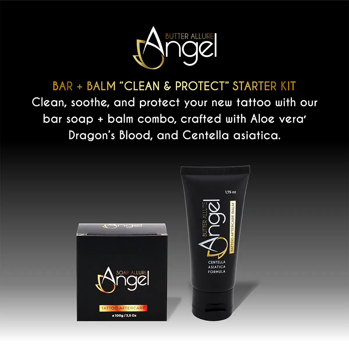 Keep your new tattoo clean, calm, and protected with the Bar + Balm “Clean & Protect” Starter Kit. This simple two-step routine includes Angel Soap Allure plus Angel Butter Allure. Together, they help support comfortable healing and vibrant-looking ink.